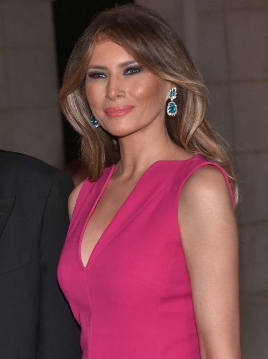 Melania je ovu pomalo zahtevnu nijansu vešto uklopila sa potpeticama u istom tonu i dijamanstkim minđušama plavo-zelene boje koje su stavile akcenant na njeno lice i boju očiju.