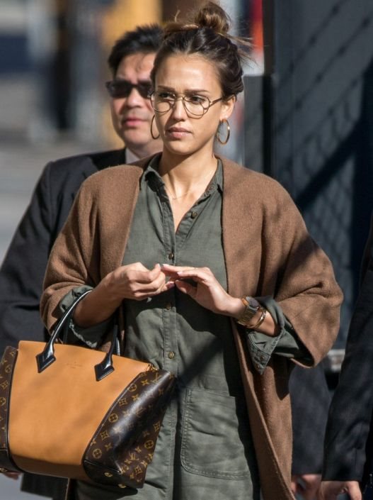 Jessica je istupila na ulice u pamučnom maslinastozelenom kombinezonu na dugmiće, sa širokim prednjim džepovima, preko kog je obukla ogrtač u braon boji. Uz ovo kežual izdanje, glumica i preduzetnica uparila je sive patike sa platformom i kvalitetnu kožnu LV torbu, kao i njene, sada već poznate, geek naočari sa okruglim staklima.