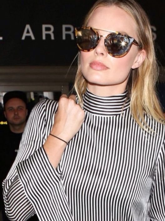 Lepa glumica fotografisana je na aerodromu u zanimljvom i svakako vrlo lepom modnom izdanju. Čitavim izgledom dominirala je fantastična svilena tunika na tanke, crno-bele pruge sa rol kragnom u vidu okovratnika, nešto širim rukavima, kao i celim gornjim delom koji je oversized.