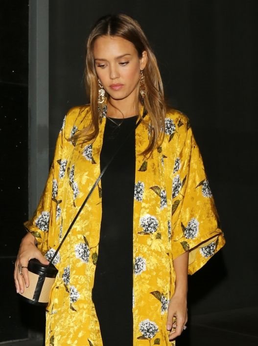 Preko klasične crne haljine tunike, Jessica je ponela svileni kimono ogrtač u jarkoj zlatno žutoj boji. Dezen cvetića na ogrtaču bio je nalik obliku njenih visećih minđuša, koje su se tonom takođe uklapale u izgled ogrtača.