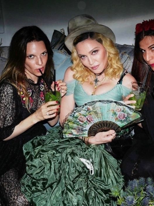 Maksi haljinu Madonna je upotpunila heklanim belim džemperom koji je definitivno zaokružio jedan italijanski stilski šmek, tipičan za izvornu modnu kulturu ove zemlje. Ni ostatak nije zanemarljiv: panama-šešir, torba sa aplikacijama voćkica, alke i lančići.