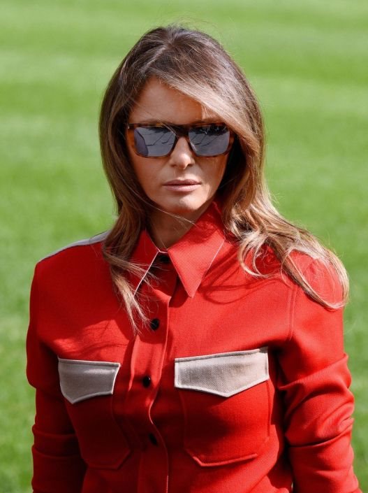 Crveno-bež košulji i tamnim pantalonama, Melania je dodala neočekivane modne dodatke, posebno ako imamo na umu da većinu vremena provodi u vrtoglavo visokim štiklama.
