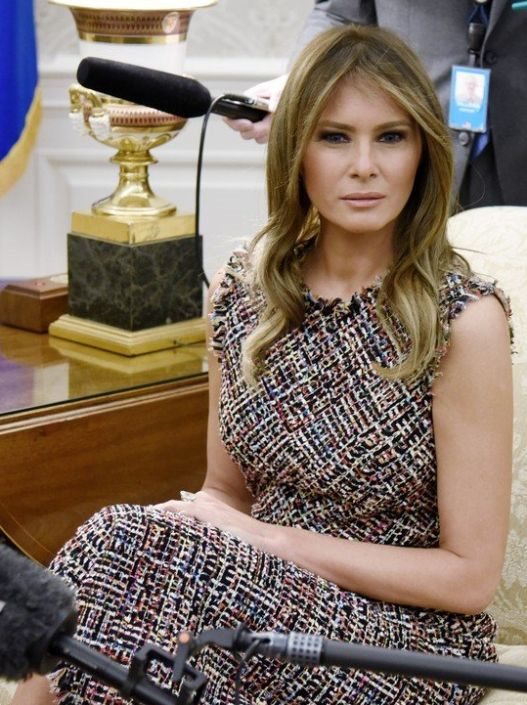 Slične modele samo s potpisima Delpoza, Giambattiste Vallia i Simone Roche viđali smo u njenoj režiji. Pletenu haljinu koja je vrlo lako mogla da bude i model Chanela jer ima taj tkani rad svojstven francuskoj kući, Trump je uparaila stiletto salonkama u boji duleka koje su rad njenog omiljenog dizajnera cipela - Louboutina.