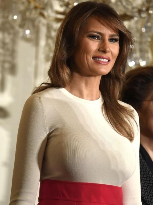U stilu pin-up diva poput Marilyn Monroe i Jane Maysfield, gospođa Trump je za ovu priliku ponela beličasti džemper pripijen uz telo, koji je istakao njene obline i suknju midi dužine, sirena kroja sa karnerima pri dnu u crvenoj boji.