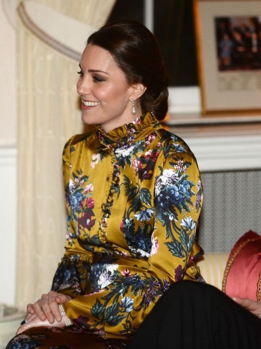 Britanski par je prisutvovao gala večeri koju su organizovali švedski premijer i njegova supruga i tom prilikom lepa Kate je blistala u dugoj haljinu koju potpisuje modni dizajner Erdem. Kreacija cvetnog dezena u osnovi je zlatne boje, dugih rukava dok posebnu sofisticiranu draž daje ruska kragna, kao i preklop na grudima.