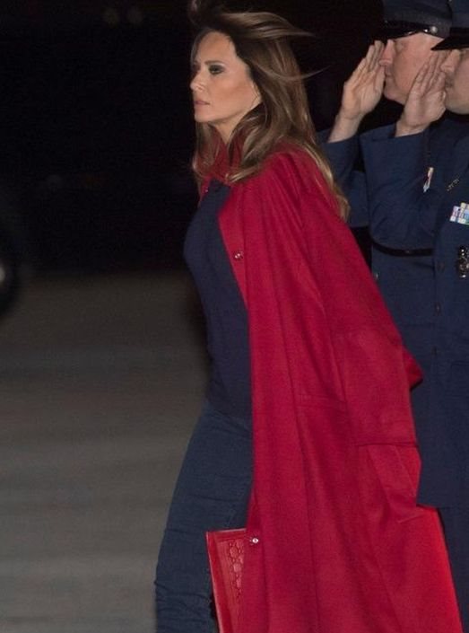 Prva dama Amerike nosila je tamnoplavi jeans i teget pulover, a kaput je bio crven, kao i torbica, dok su štikle njene omiljene marke Louboutin, ujedinile obe boje.