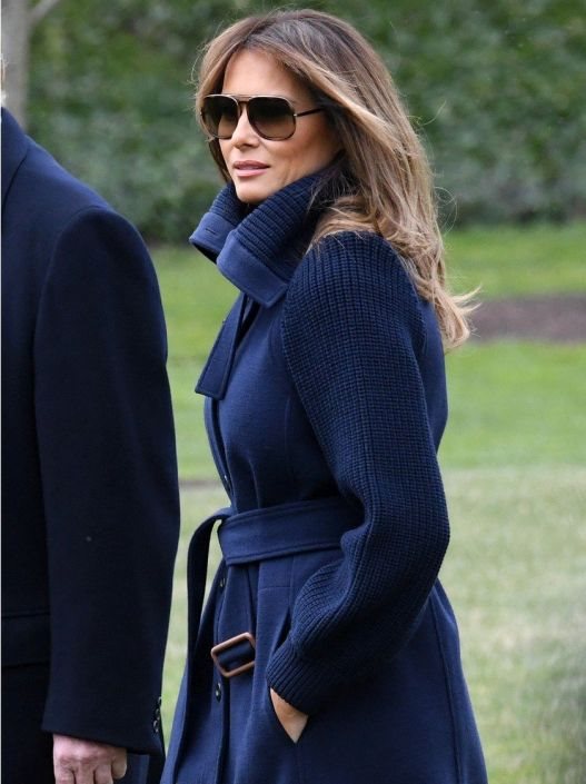 Prelep Chloe kaput od kašmira u teget boji, dužine je ispod kolena, i nosi vajb 60-ih godina. U svom stilu Melania je struk naglasila kaišem dok se u sferi obuće opredelila za fantastične, polunabrane Gianvito Rossi čizme na visoku, blok štiklu karamel boje.