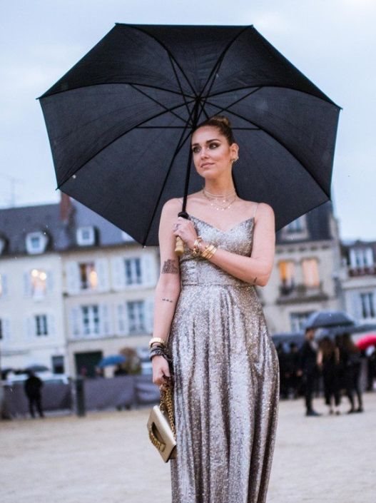 Naspram nje, Chiara koja se nedavno porodila, opredelila se za haljinu od srebrnog žakarda na bretele, podignutu kosu, nekoliko sitnih ogrlica nanizanih zajedno, zlatnu torbu i puderaste Dior Jadore salonke na špic i kitten štiklu.