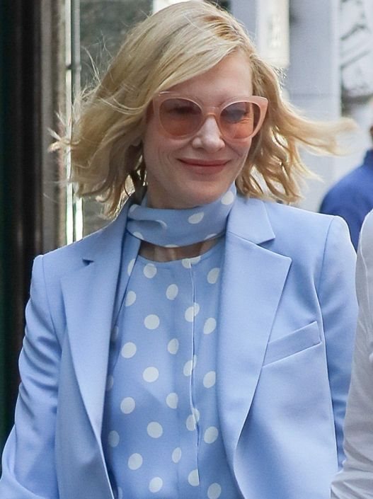 Cate je obukla lagano, svetloplavo odelo koje se baziralo na malo podužem sakou i pantalonama na ivicu. Posebnu ljupkost Blanchett je dobila zahvaljujući košulji u boji neba sa belim tufnama i marami istog dezena, dok je kompletan look finiširan belim salonkama i oversize torbom od bele kože.