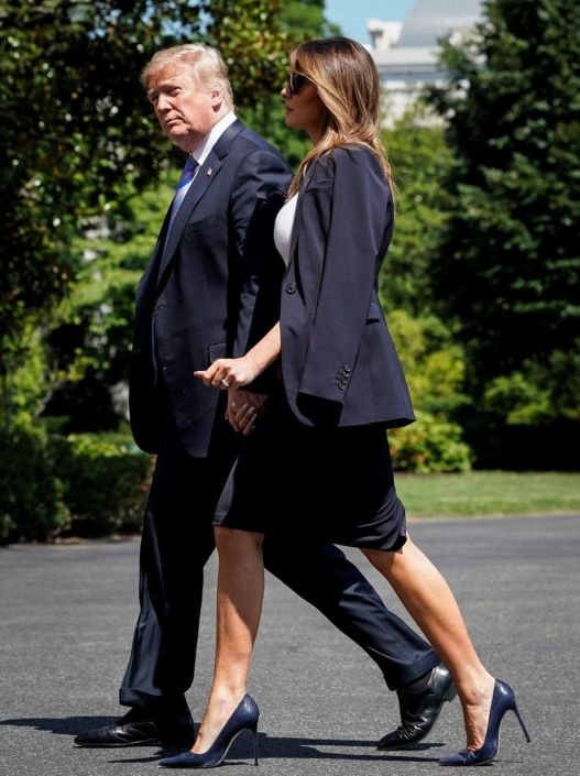 Poslovna odevna kombinacija Melnije Trump sastavljena od teget suknje, bele košulje i strukiranog teget sakoa elegantno prebačenog preko ramena, još jednom je izazvala oduševljenje.
