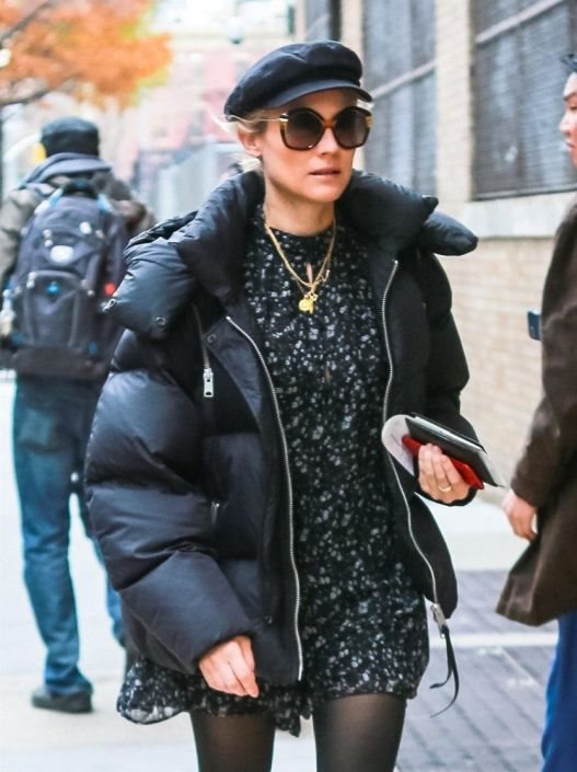 Zvezda filmova Mr. Nobody i In the Fade mini, crnu haljinu sa sitnim cvetovima nadogradila je efektnim čizmama do malo iznad kolena na štiklu, avijatičarksom kapom i naočarama. Ovakav modni spoj, Krugerova je finiširala pufnastom, crnom jaknom, koja se pokazala kao odlična zamena za ne tako topli kaput.
