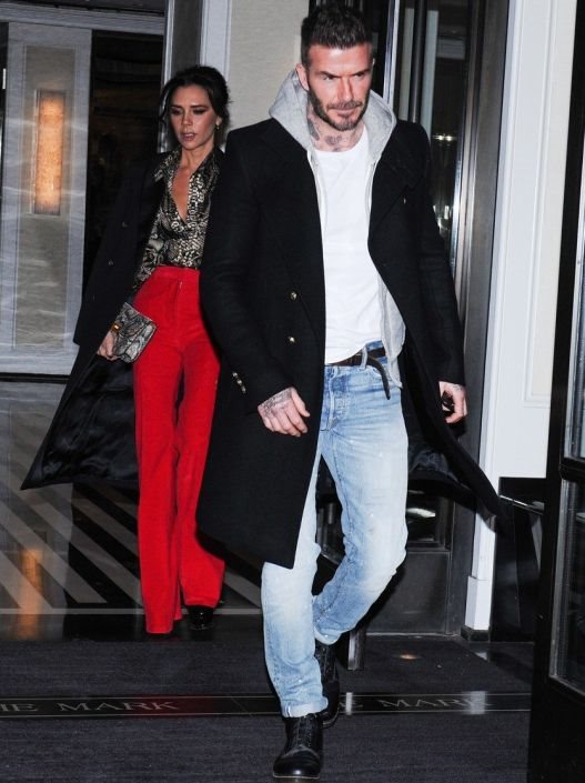 Njegov casual look ispratila je Victoria koja se opredelila za fantastične crvene duboke pantalone na crtu, svilenu košulju piton dezena i crni vuneni kaput, svilenih revera, dužine do kolena koji je njenu figuru dodatno izdužio.