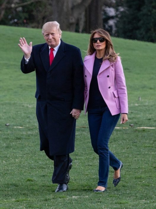 Uz lakovane baletanke, lepa Melania je nosila farmerke ravnog kroja i običnu teget majicu, a celokupan izgled je upotpunila efektnim kratkim kaputom u roze boji.