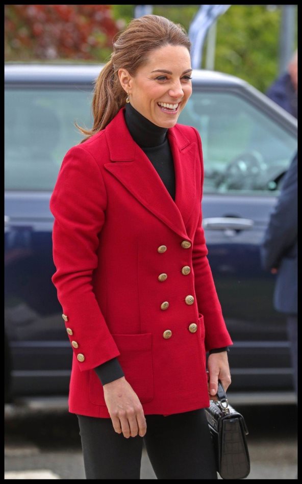 Provereno dobru kombinaciju, koju su mnogi pohvalili na "novoj" Kate, vojvotkinja prvenstveno zahvaljuje atraktivnom crvenom sakou sa dva reda dugmadi brenda Philosophy.