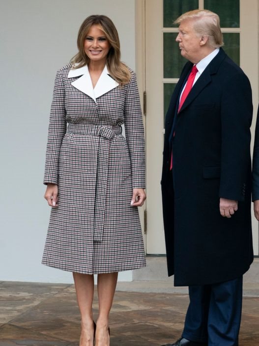 Prva dama Amerike za ovu priliku izabrala je još jednom odevnu kombinaciju (to jest modni komad) koja polako ali sigurno postaje njen zaštitni znak - kaput efektne boje ili printa koji prati liniju tela i kaišem se ustručuje u pojasu, koji Melania nosi poput haljine.