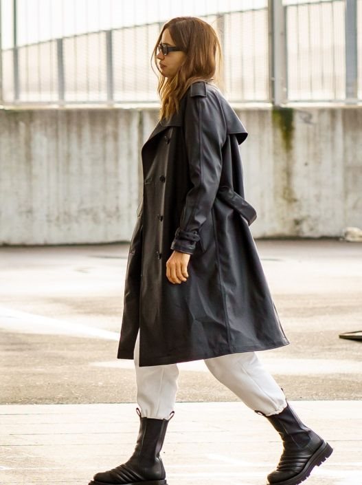 Donji deo bele trenerke upasala je u nogavice sportskih kožnih čizama koje potpisuje trenutno jedan od najpopularnijih brendova Bottega Veneta (cena im je oko 800 evra), a kompletan stajling zaokružila je Burberry kožnim mantilom i aksesoarom u vidu crnih sunčanih naočara.