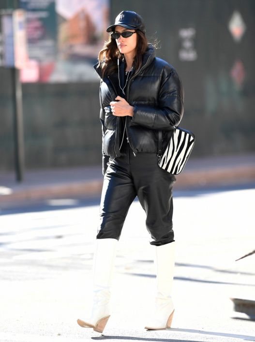 Crne kožne pantalone dubokog struka, kratki kožni sako, kratka perjana jakna sa odsjajem koji takođe podseća na kožu, bele kožne čizme, crni kožni kačket i tašnica zebrastog printa.