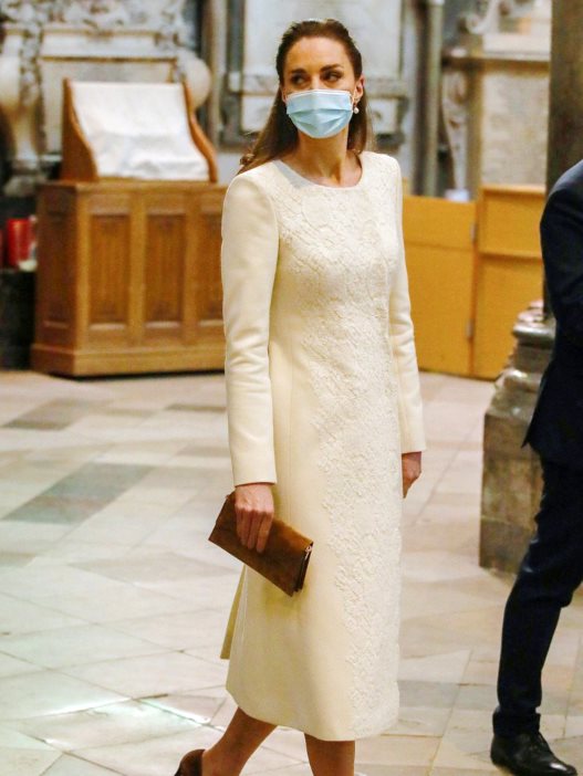 Za tu priliku, Kate je po običaju odabrala svoju omiljenu marku Catherine Valker, koja je prati na svim bitnim dešavanjima. Ona nosi elegantnu bež kaput-haljinu ukrašenu svedenim ornamentima. Ceo outfit upotpunjen je bisernim minđušama, te Jimmy Choo potpeticama i Metier London tašnom u istom tonu.