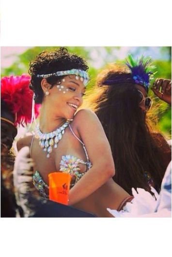 Odevena poput plesačica sambe, Rihanna je i ovog puta malo toga prepustila mašti. Kostim od kristala prekrio je tek intimne delove pop-zvezde, a stavivši u prvi plan njeno savršeno oblikovano telo. Rihanna je fotografije podelila sa fanovima putem društvenih mreža.