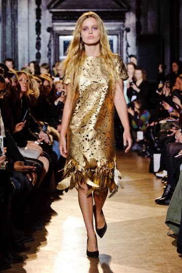 Veliki broj dizajnera je u kolekcijama za sezonu J/Z 2013-14 kreirao modele u zlatnoj boji. Naš predlog je da zlatni komad odeće iskombinujete uz boju kože, i nijanse bež, krem boje jer tada efekat zlata biva još veći. Foto: