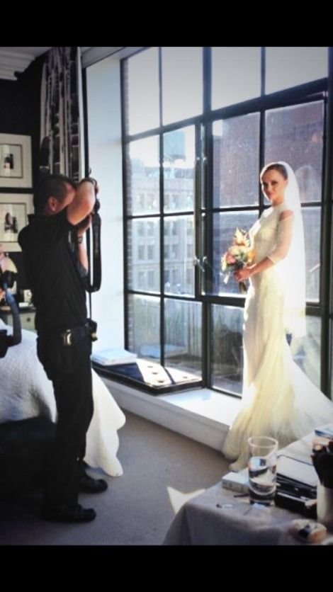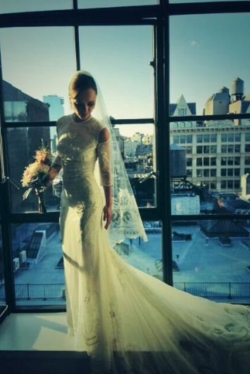 Na fotografijama glumica ponosno pokazuje dugu belu venčanicu, savršeno strukiranu, sa velikim šlepom i izrađenu od skupocene chantilly čipke, od koje je izrađen i dugi, prefinjeni veo.