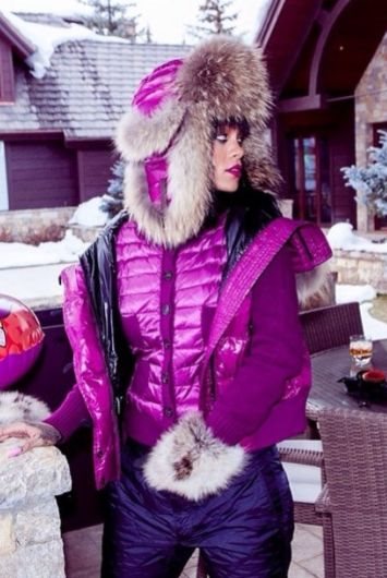 Lepa barbadoška pevačica svoj slavljenički dan provodi u društvu prijatelja, odevena u ljubičasto-ružičastom skafanderu uz koji je uskladila i ruž na usnama, a na glavi je imala krznenu šubaru.