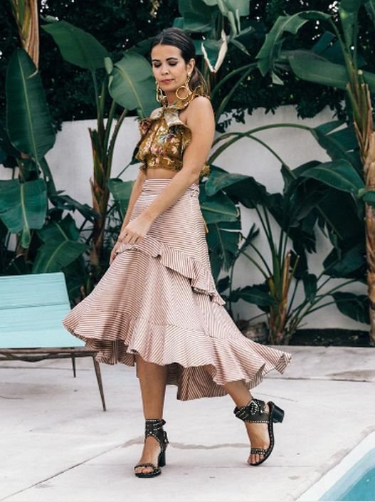 Ovakve suknje s kosim, asimetričnim volanom, ušivenim naborima ili pravilnim volanom koji se proteže od koljena prema dole ovog proleća su vrlo popularne.