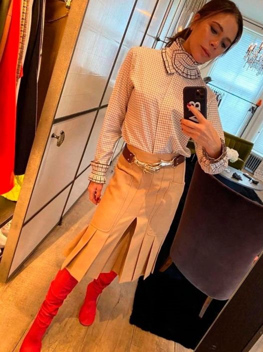 Bež suknja na falte u vidu resa, košulja na sitne kocke sa kragnom koja izgleda kao da će da je zadavi, crvene čizme i kaiš koji je izazavao apsolutnu eksploziju na internetu: kožnog braon remena sa srebrnim šakama koje se dodiruju.