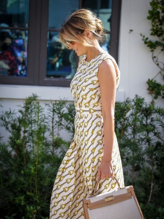 Za ovu priliku izabrala je elegantnu dezeniranu haljinu sa faltama koju potpisuje Gucci, dok je aksesoare uklopila nezavisno od tonova na haljini.