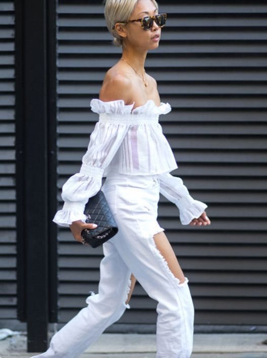 Popularna modna blogerka beli iscepani boyfriend jeans uparila je sa hit komadom ove sezone, belom bluzom golih ramena.