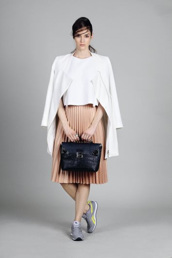 Gordana: Svedena forma i čist kolorit pružili su mi priliku za pažljivim odabirom materijala. Meku i neobaveznu siluetu, naglašenu sportskim patikama, učinila sam neodoljivo ženstvenom suknjom od plisea.