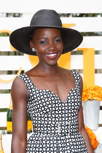 Kompletan look je odisao retro stilom, najviše zahvaljujući ženstvenom dekolteu i lepršavom kroju haljine, ali i propratnim aksesoarima: crnom šeširu, kožnim platformama sa kaiščićima (Christian Louboutin) i maloj crno-beloj torbi koju takođe potpisuje Alexander McQueen. Naravno, neizbežan detalj su bili Lupitin osmeh i plava senka bez koje ne izlazi iz kuće.