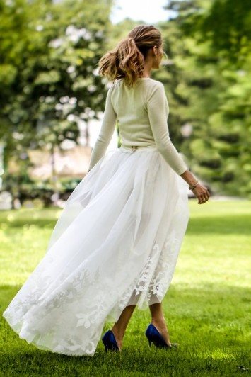 Umesto klasične i tradicionalne bele venčanice, Palermova se opredelila za „trio“ u vanilakrem boji: džemper od kašmira, zatvorenog dekoltea i dugih rukava koji je uparila s dugačkom, belom suknjom od tila s ukrasnim vezom pri rubu i šlicem, koju je obukla preko jednostavnog, belog šortsa.