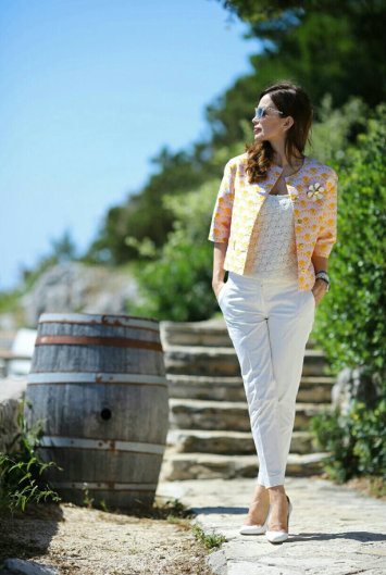 Prvi put smo je demonstrirala kako se nosi elegancija kada je prošetala jaknu s potpisom italijanskog brenda Moschino, u paru sa bluzom hrvatske dizajnerke Aleksandre Dojčinović, pantalonama kuće Etro i sa slavnim ‘Manolicama’ na nogama (glavna slika).
