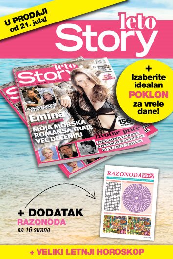 Dok uživate na plaži ili u lepotama leta u gradu, u ovom jedinstvenom izdanju pročitajte zanimljivosti iz života filmskih superzvezda Dženifer Lorens, Antonija Banderasa i Elizabet Tejlor. Za one posvećene modi, Story je spremio odličan letnji modni izveštaj, dok se u ulozi modela našla simpatična pevačica Ana Bebić. Diva pop muzike Emina Jahović samo za Story leto otkriva kako s porodicom uživa u vrelim letnjim danima i zašto joj prija pecanje.