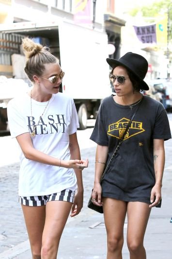 Zoe Kravitz je bila stilizovana u vintage 'Beastie Boys' majicu savršenog natpisa, 'Get Off My Dick', crni šorts, crne “mule” sandale i crni šešir. Za razliku od Zoe koja je bila kul, ali rock kul, Cara Delevingne je za casual šetnju izabrala belu majicu sa natpisom Bashment, šorts sa crno-belim prugam, Chanel patike i naočare s oslikanim staklima.