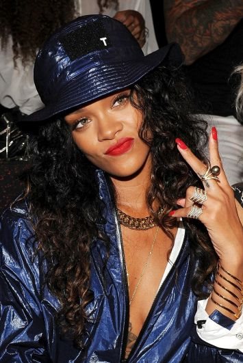 Ako je ova kreacija bila svedena i krajnje neočekivana, onda je sledeća u kojoj se Rihanna pojavila na reviji Alexandera Wanga bila totalno u stilu dive. Svetlucava, plava, oversize jakna (nalik kabanici) ispod koje pevačica ništa nije obukla i koju je stilizovala u paru sa mnogobrojnim statement prstenjem, šeširom od istog materijala i četvrtastom plavom torbom s animal print uzorkom.