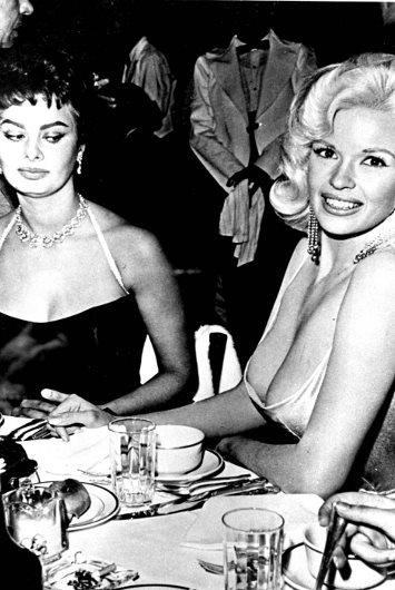 „Paramount je organizovao žurku u moju čas. Svi ljudi iz sveta filma su bili tamo i bilo je zaista neverovatno. A onda ulazi Jayne Mansfield, poslednja od svih zvanica. Tek tada je sve postalo zabavno… Došla je pravo do mog stola. Znala je da svi gledaju. Sela je. A jedva da je bila… Slušajte. Pogledajte fotografiju. Gde su mi oči? Gledam u bradavice, jer se bojim da će završiti u mom tanjiru. U mom izrazu možete da vidite strah. Bila sam toliko uplašena da će sve što se nalazi u njenoj haljini eksplodirati i razliti se po celom stolu“, suptilna je Sophia.
