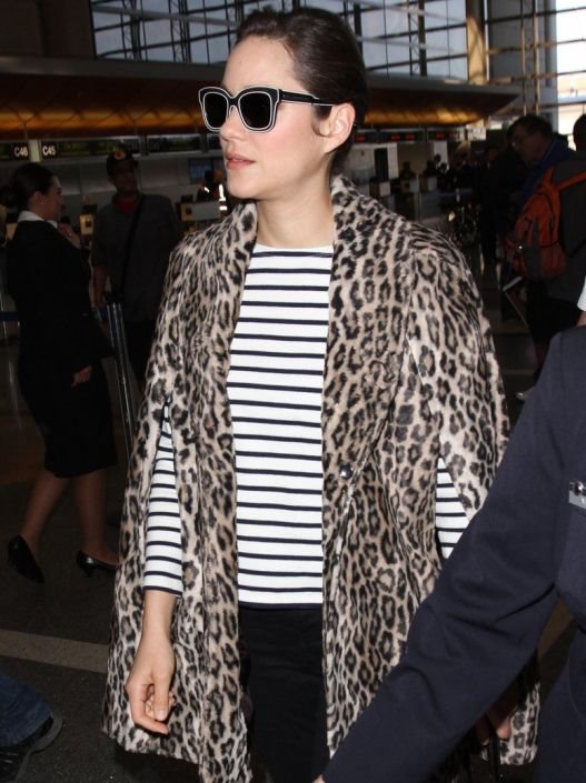 Cotillard je sletela na aerodrom LAX (Los Anđeles) obučena u prugastu pamučnu majicu, crne pantalone, savršene Oksfordice i šik krzneni ogrtač u efektnom animal printu. Kao najsavršeniji ambasador brenda, Marion je kompletan airport look nadogradila klasičnom Lady Dior torbom.