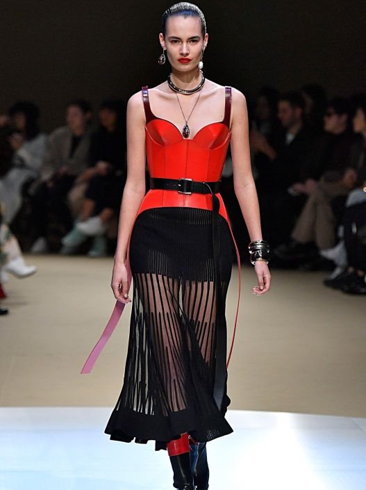 Od materijala preovladavala je svila, koža, saten, pa i spandex i ponešto čipke, koja je u kombinaciji stvarala utisak pomalo dominatnih fetiš outfita, estetika kakvu je mahom zastupao sam Lee McQueen.