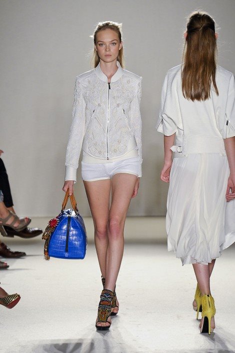 Oštre geometrijske forme, kruti materijali i predimenzionirani šeširi sele nas u neko buduće vreme. Moderna žena koja živi brzo može ovo da iznese. Šortsevi su kombinovani sa oversize sakoima i košuljama, a haljine karakteriše miks dezena ili pvc rese. Foto: