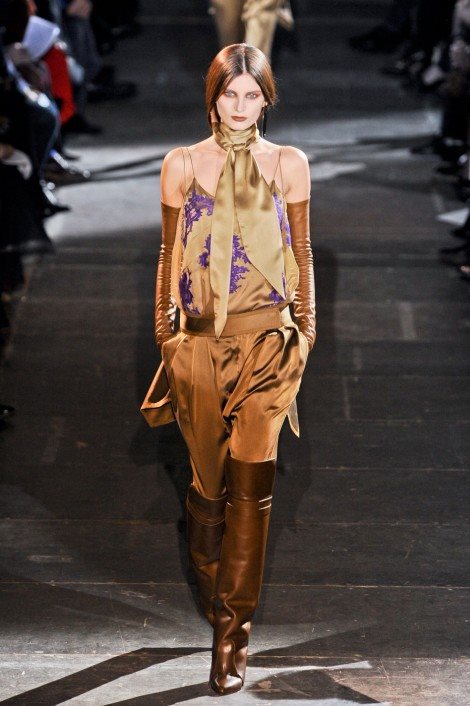 Kaputi u "A" formi, i jakne u stilu Mary Poppins sa upadljivim moćnim kragnama, preko suknji i pantalona iste boje ili printa. Kaputi pastelinih boja ukrašeni su ogromnim dugmadima i u kombinaciji su sa pantalonama dužine 7/8, a dugačke haljine i suknje nose se preko pantalona od lamiranih materlijala. Veliki šeširi ukrašeni su krznenim brošem. Foto: