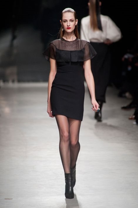 Kolekcija inspirisana plesnim parom Freda Astaire i Ginger Roger iz filmskog klasika „Top Hat“. Kolekcija na neobičan način spaja muški i ženski princip u jedan. Krzna, rese, svetlucavi materijali, pantalone ispod suknje, cvetni dezeni i još mnogo toga krasi ovu reviju. Foto: