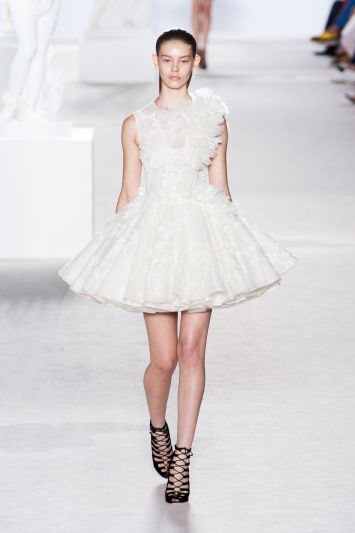 Drugog dana pariske Nedelje visoke mode predstavljena je kolekcija modne kuće Giambattista Valli haute couture za jesen/zimu 2013/14 . Slavni kreator je inspiraciju pronašao u porcelanu, a i sama scenografija je bila u tom duhu. Kolekcijom dominira nežna i romantična bela boja koja je osvežena pastelnim detaljima žute i pink, ali i komadima u jarkim bojama. Volumen je glavni element ove kolekcije koji se povlači kroz sve kreacije. Foto: