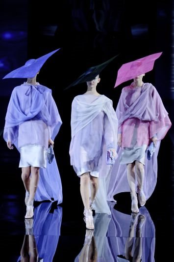 Armani se poigrao i sa metamorfozom – ultra dugačka cvetna jakna koja kao da "uranja" u haljinu i ravne čizme koje se transformišu u plave čizmice do članka sa pleksiglas potpeticama.