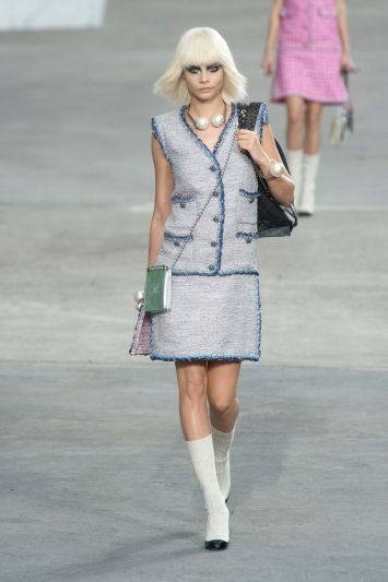 Glavna revija sezone bila je drugačiji, energičniji Karl, a opet i onaj očekivan, klasičan. Reviju je otvorio model u ravnoj tvid haljini bez rukava u ledeno plavoj boji, uparen sa crno-belim salonkama i belim soknama, dok su glavni detalji bili kratka ogrlica s dva XXL bisera i duple torbe, metalik mala na lanac i kožna crna prebačena preko ramena.