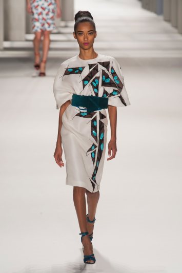 Moćan i prilično ozbiljan početak pun "teških" modela i tamne palete, Carolina koja se smatra jednom od najboljih kreatorki kada je u pitanju ženstven, elegantan look, je oplemenila s geoemetrijskim printom sastavljenim od braon i sivih trouglova koji su najbolje "legli“ na lepršave, maksi haljine diskretnog polu V izraza, ali i uzane kostime.