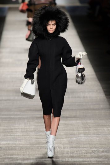 Reviju je otvorila Cara (a ko drugi?) stilizovana u chic, crni kaput sa krznenom kapuljačom, sa belim poludubokim čizmicama na nogama i posebnim detaljem: priveskom od malog krznenog “monstruma” koji strašno podseća na Karla Lagerfelda! Aksesoar kompletne kolekcije, ako ne i dosadašnjeg modnog ciklusa!