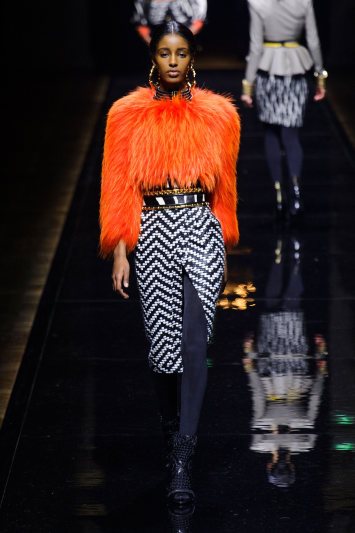 Modeli predvođeni s Joan Smalls i Rosie Huntington-Whiteley su nosili jakne u military stilu u braonsivoj boji sa chic pantalonama, peplum bluze raskošnog veza, krznene kratke majice, kombinezone na jedno rame, kožne jakne s naborima, ali i parke s krznenim rukavima.