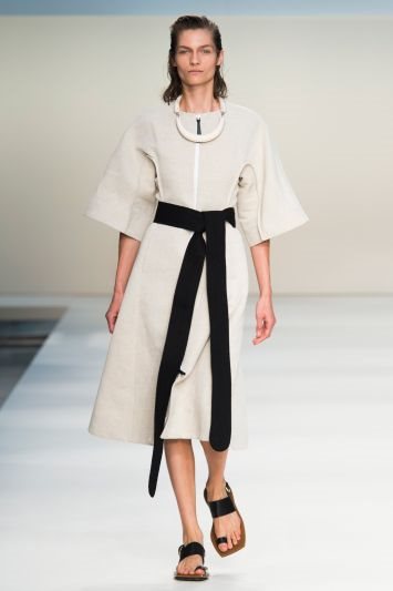 Kolekcija za proleće/leto 2015 koju nam je prikazao moćan trio ispred Marnia, je bila kombinacija eksperimentalne, arhitektonske, grafične i ženstvene mode. Reviju je otvorio model stilizovan u lanenu haljinu-kaput, A forme, u pesak boji, pričvršćenu crnom, širokom trakom koja je “glumila” kaiš i ravnim, kožnim polujapankama, polusandalama.